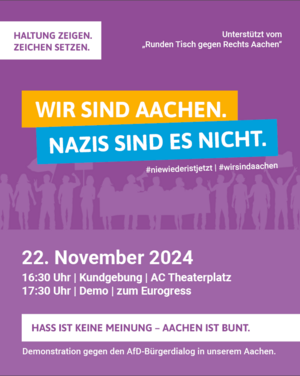 „Wir sind Aachen“ ist ein breites, informelles Bündnis aus Organisationen, Parteien, Gewerkschaften, Religionsgemeinschaften, Vereinen und Einzelpersonen aus Aachen, die sich entschieden gegen diese Veranstaltung positionieren. Wir stehen für ein solidarisches und friedliches Miteinander ohne Hass und Hetze.