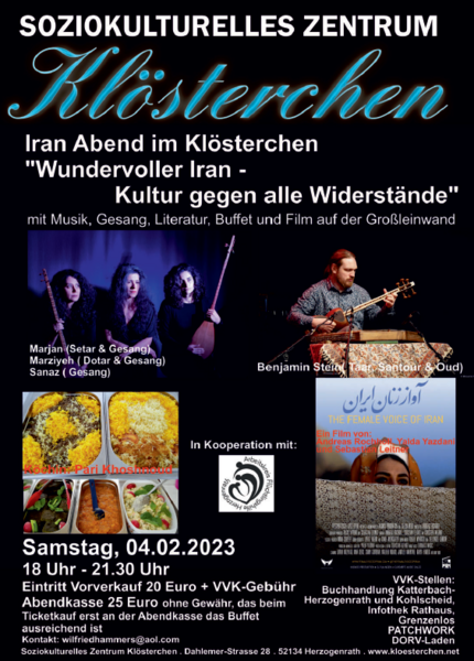 Am 4. Feburar 2023 findet im Klösterchen ab 18:00 Uhr der Iran Abend statt. Der Abend soll die wundervollen Seiten des Irans aufzeigen. Daher begleitet dich Musik, Gesang, Literatur, Buffet und ein Film auf der Großleinwand durch diesen.