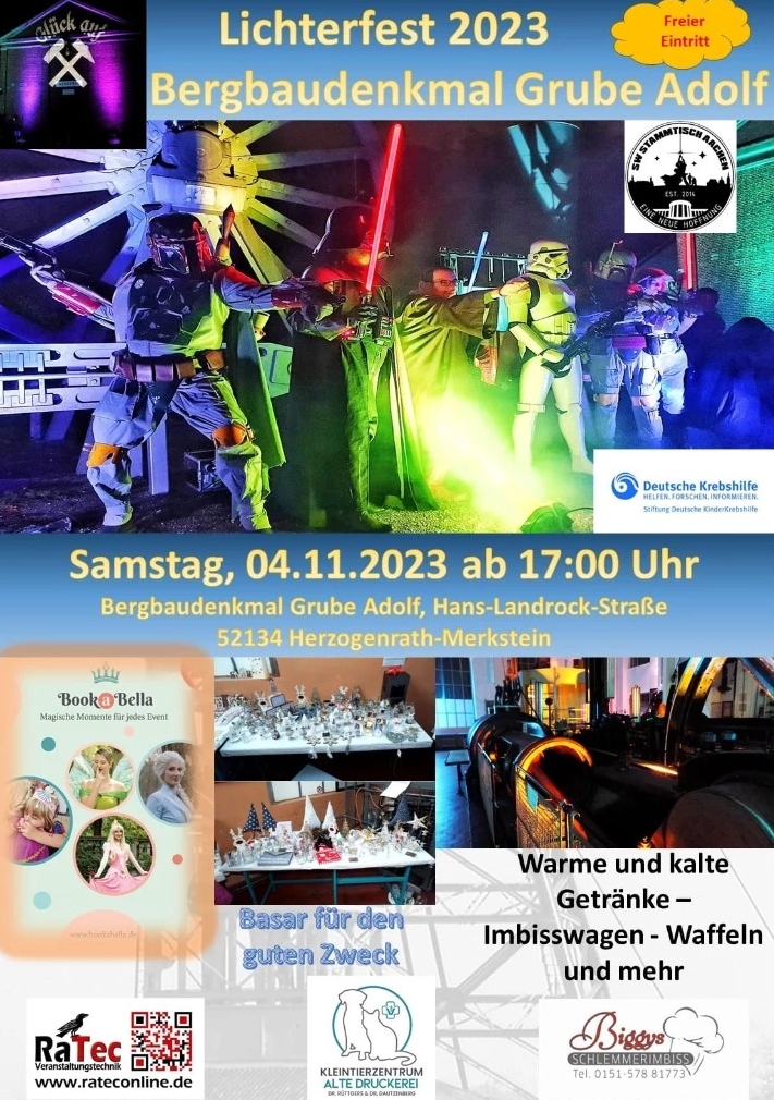 Am 4. November findet das Lichterfest statt. Ab 17:00 Uhr könnt ihr das Lichterspektakel erwarten und bei Getränken, Imbisswagen, Waffeln und vielem mehr einen tollen Abend genießen. Seid dabei und macht unsere Stadt lebendig!